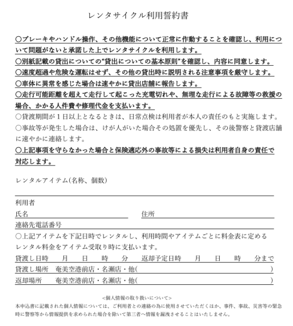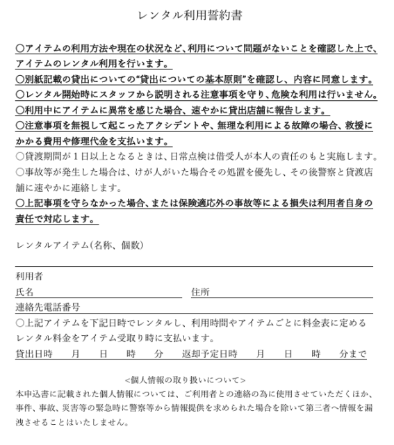 ご予約済のお客様であっても、貸出時にそれぞれのアイテムごとに定められた誓約書にご記名いただく必要がございます。ご理解・ご協力のほど、よろしくお願いいたします。