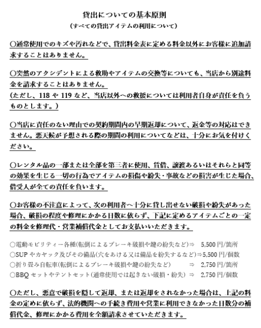 また、アイテムの利用が危険と判断される状況では、ご予約済のアイテムであっても店舗側からご予約を取り消させていただく場合もございます。